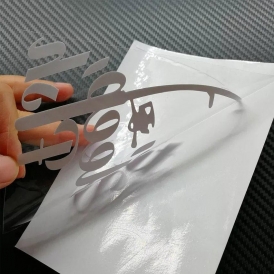 Vinil adesivo recortado eletronicamente sem fundo. Muito usado em adesivos para carros, nomes para embarcações, placas de fachadas, tabelas de preço (para substituição de valores eventuais), etc. Também muito utilizado em vidros onde se quer só as letras ou logo sem nenhum tipo de fundo que prejudicaria a transparência do vidro.