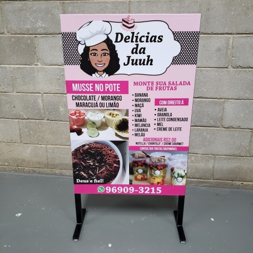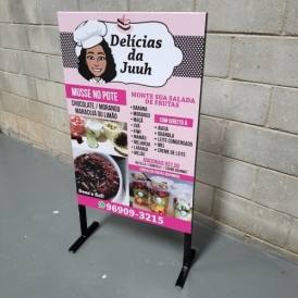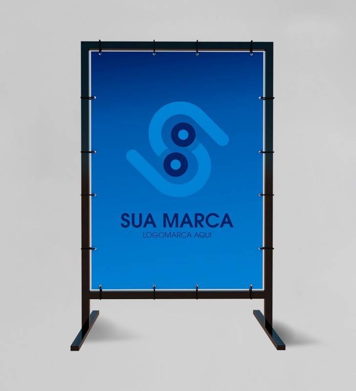 Cavalete de ferro galvanizado e pintado, não enferruja, lona dupla face (frente e verso) esticada por fita VHB dando um fino acabamento ao produto